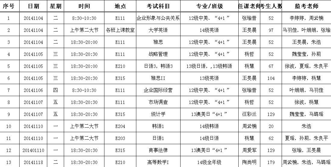 2014~2015年国教院 期中考试考试日程安排